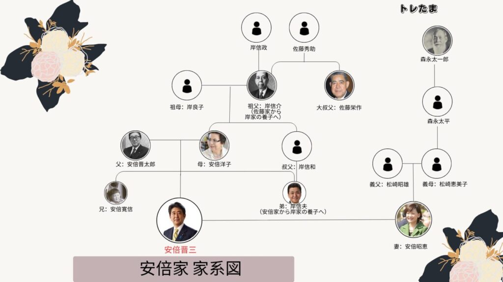 つまり、安倍晋三さんは岸信介の直系の孫にあたり、政治家一家の三代目として知られています。岸信介の政治的影響力や家族の政治家としての伝統は、安倍晋三の政治家としての道にも大きくつながっています