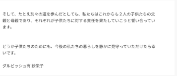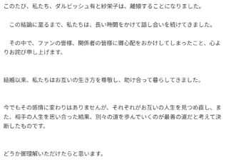 内容は、「それぞれがお互いの人生を見つめ直し、また、相手の人生を思い合った結果、別々の道を歩んでいくのが最善の道だと考えて決断したものです」というものでした。お二人の相手を思いあった気持ちが滲み出居てますよね。