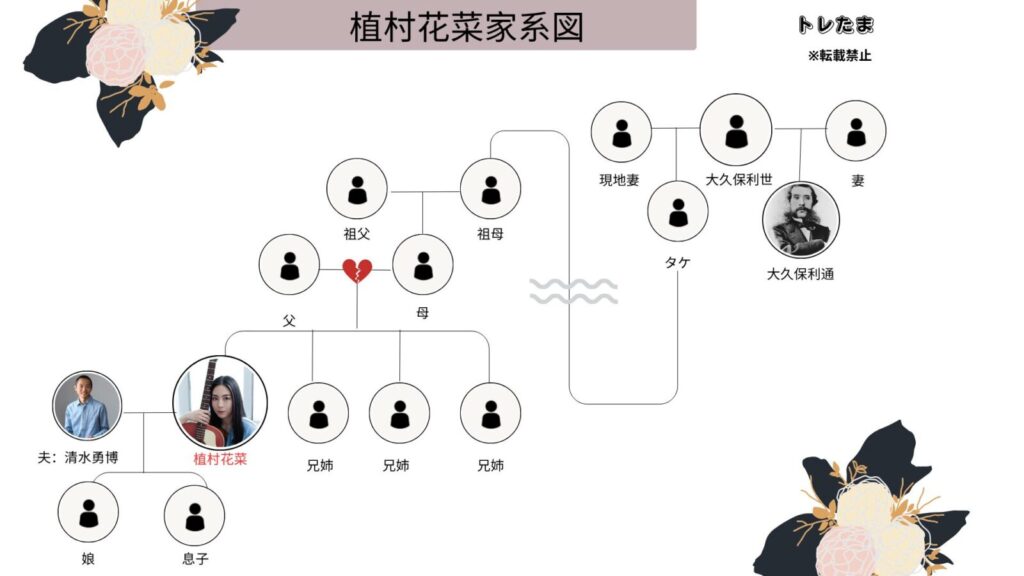 この家系のつながりは、植村花菜の祖母が鹿児島県沖永良部島の出身であることとも合致しており、彼女の音楽活動や家族観にも影響していると思われます。明治維新の時代を動かした大久保利通という歴史的大人物の血脈を受け継ぐことが、植村花菜さんにとっても誇りやルーツとして意識されているようです。